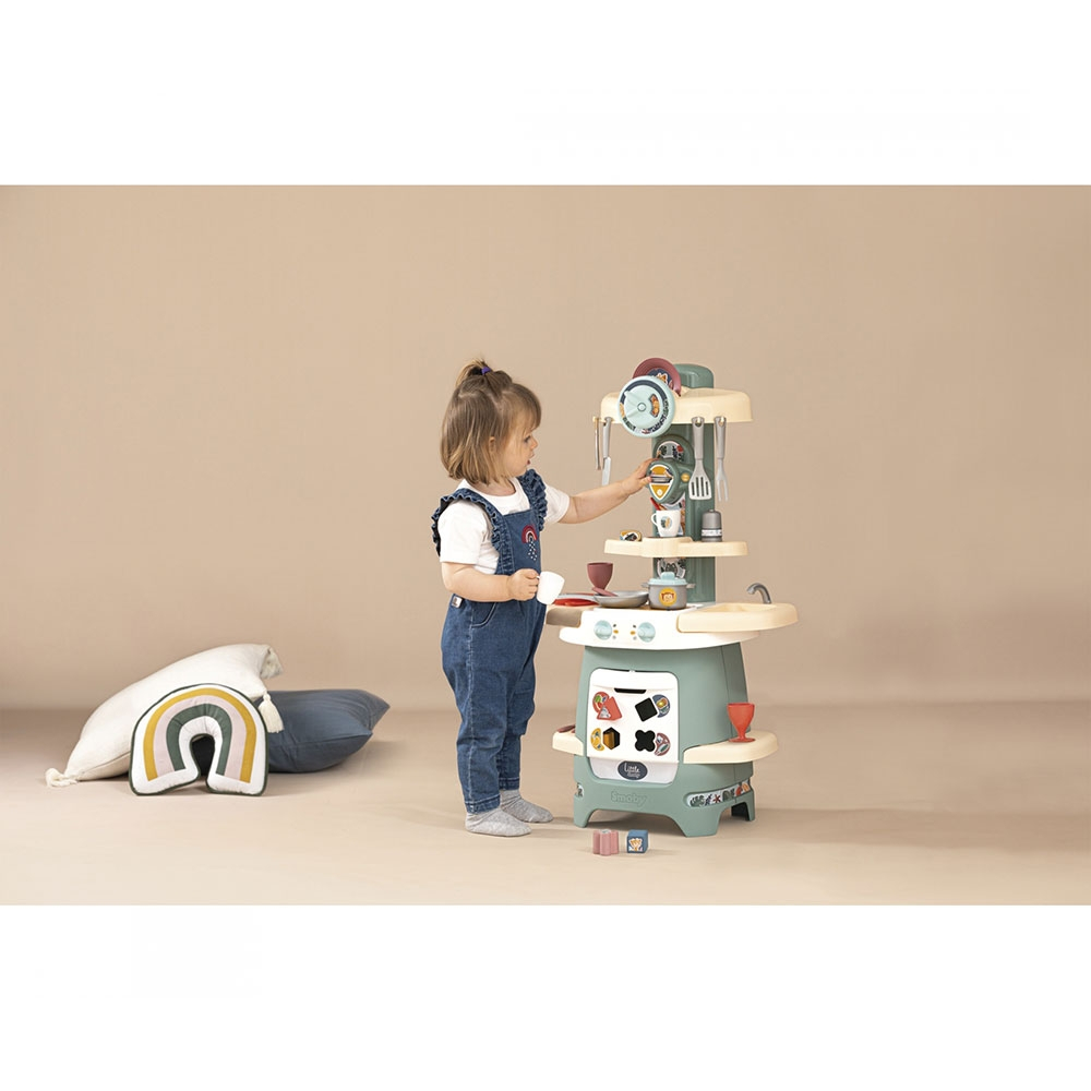 • Bucataria Smoby este dotata cu 25 accesorii interesante. Printre aceste accesorii se regasesc: aragaz, chiuveta, cuptor, tacamuri, aparat de cafea, farfurii, cani, pahare, solnita, 4 cuburi didactice de sortare si multe altele