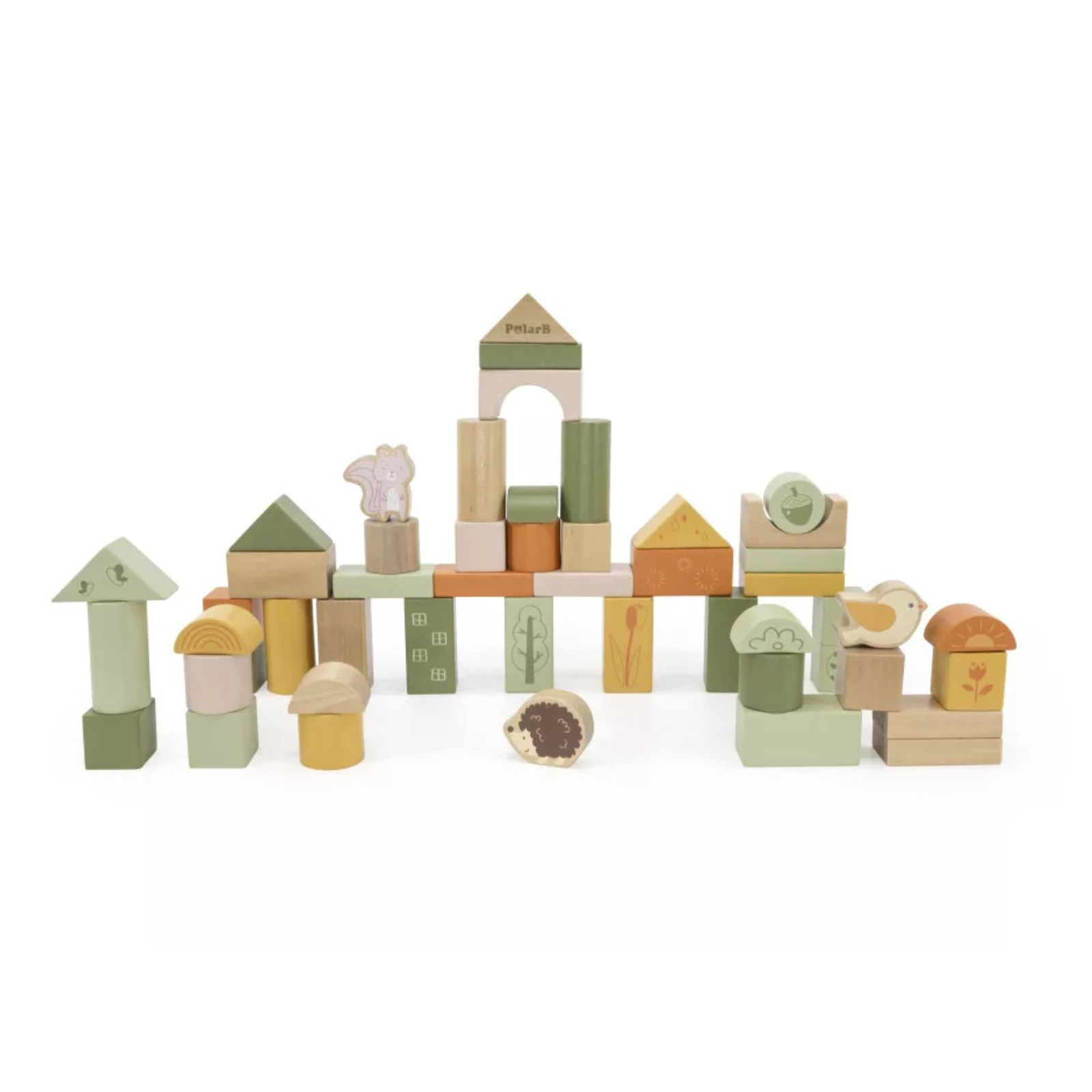 - Setul de constructii este fabricat din lemn, contine 50 piese de lemn de diverse forme, dimensiuni si culori, care pot fi combinate dupa plac.